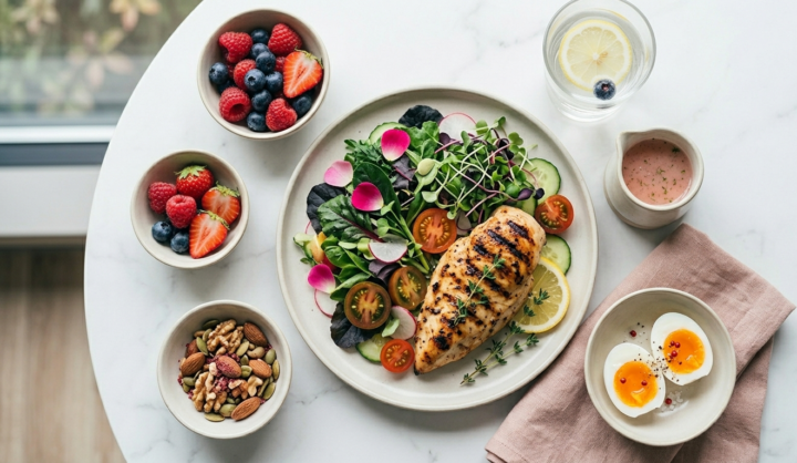 ダイエット中こそタンパク質は重要です。タンパク質は筋肉だけでなく、肌・髪・爪の材料にもなります。体重1kgあたり1.5〜2.0gのタンパク質摂取を目安にしましょう。