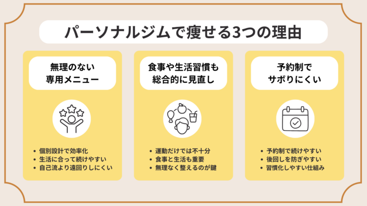 つまり、結果を左右するのは、ジムに通うこと自体ではなく、食事や頻度、継続のしやすさまで整えられるかどうかです。一人では続かなかった人ほど、自分に合う方法として活用しやすいでしょう。